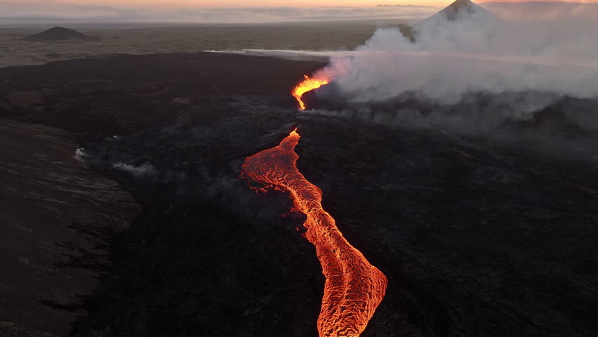 Volcano Eruption, Flowing Red Hot Lava Erupts from Crater, Incredible Natural Phenomena, Spectacular Dramatic Scenery in Iceland