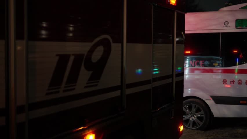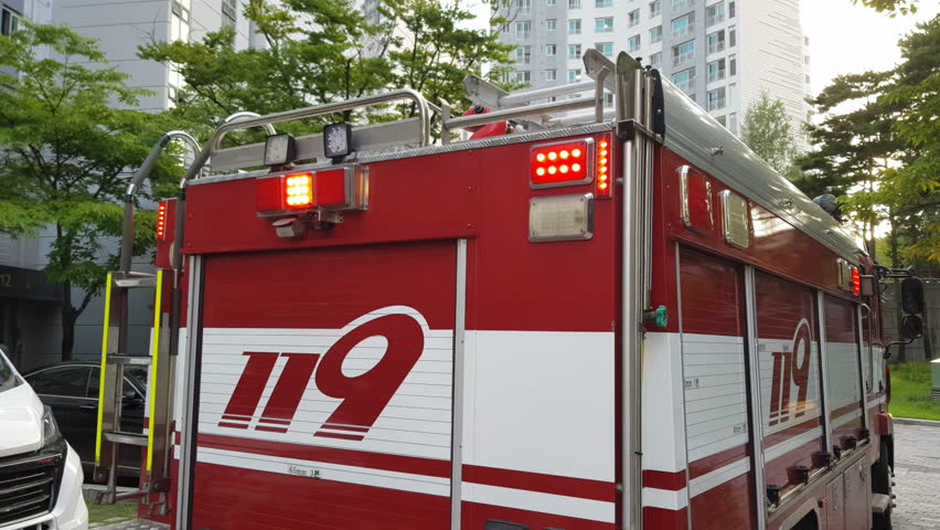 Rear Of 119 Firetruck In South Korea, Equipped With Ladder And Flashing Emergency Lights