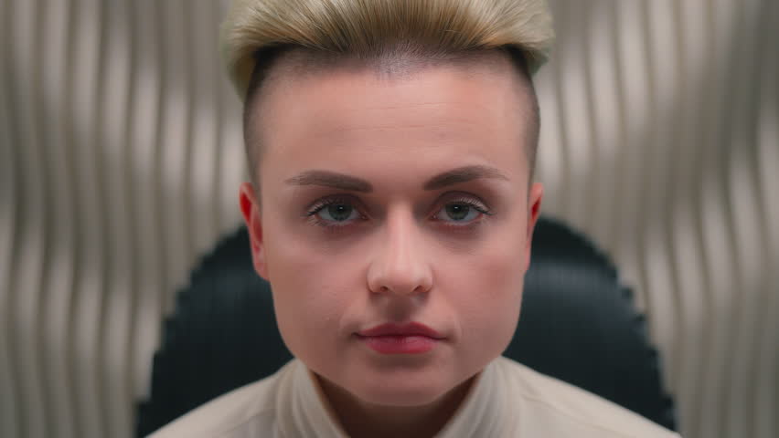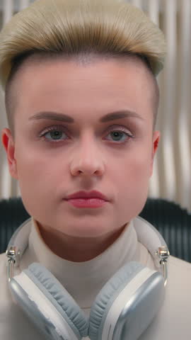 Portrait pensive serious Caucasian futuristic woman in futurism studio indoors thinking female thoughtful girl lady gamer think ponder programmer future innovation technology modern cyberpunk sci-fi