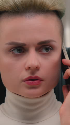 Caucasian woman girl female angry yelling talking mobile phone call yell anger talk shout conflict aggressive quarrel shout in smartphone annoyed irritated emotion bad communicate in futuristic room