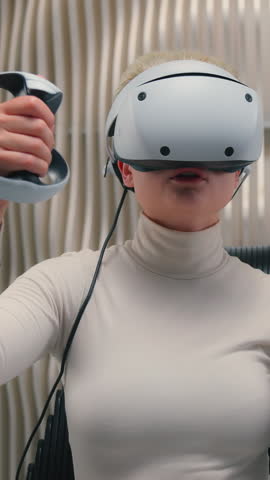 Caucasian woman wearing VR headset pretending driving car boxing playing virtual reality holding controllers play video game innovation advanced female girl in futuristic space sit in chair futurism