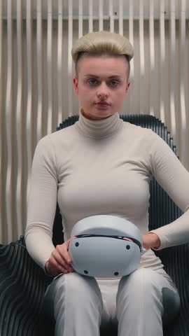 Calm Caucasian woman futuristic female girl putting on VR helmet using virtual reality for gaming work entertainment innovative futurism sitting chair leaning back watch online simulation metaverse