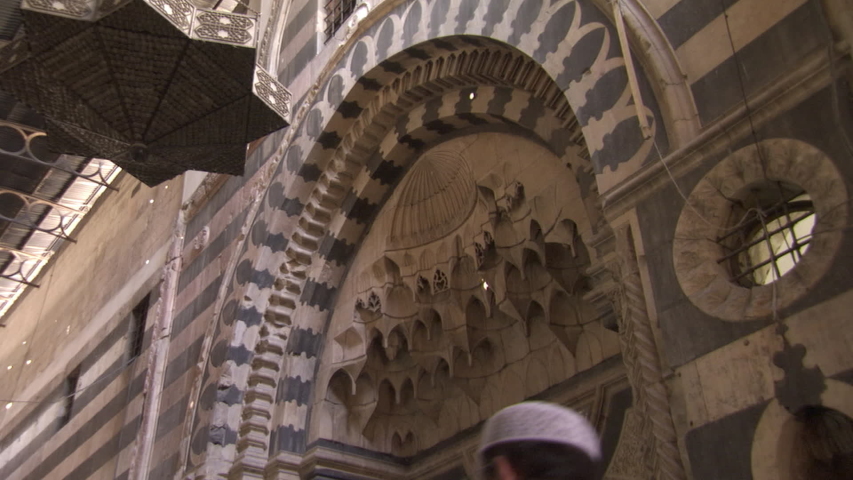 Damascus / Syria - 07 26 2010: Khan Assad Pasha Entrance Door and People Crossing the Street