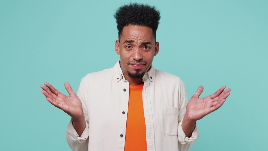 Young man of African American ethnicity wear shirt t-shirt spread hand shrugging shoulders look puzzled have no idea nothing to say I don't know why isolated on plain pastel light blue cyan background