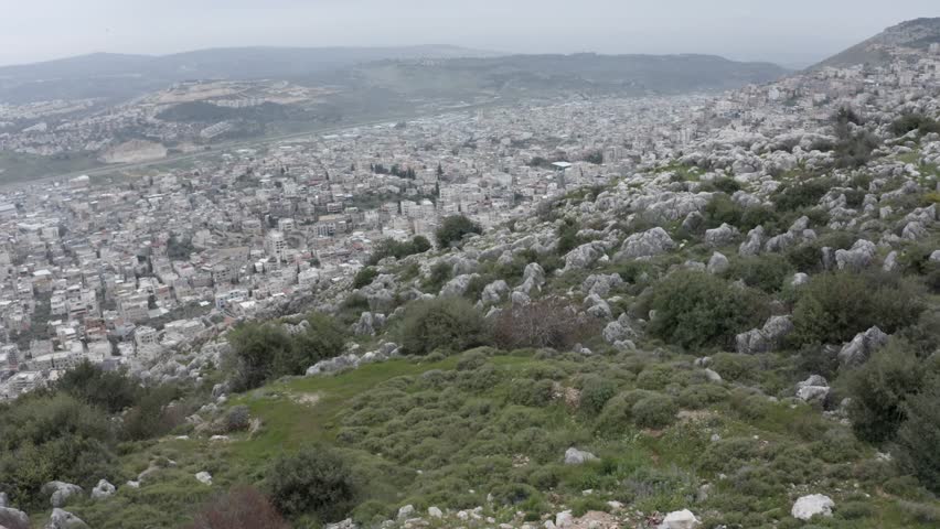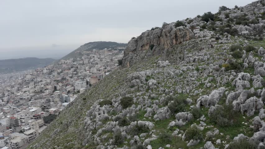 Large cliff and arab village in israel ,Aerial view Dir El Asad and Mitlol Zurim cliff, Upper Galilee, Israel, 2023