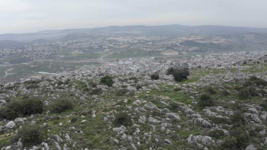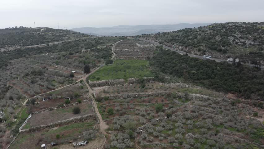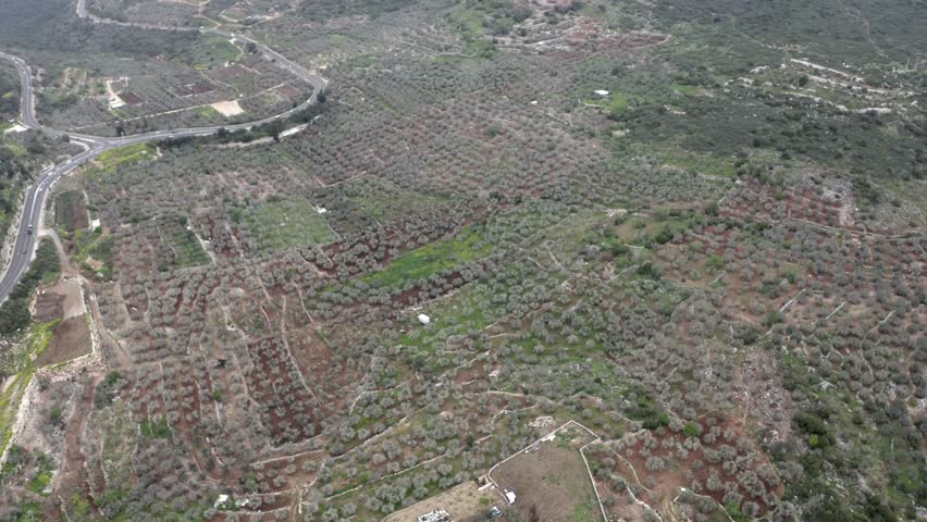 Aerial view over Palestinian olive groves, 2023 Dir El Asad, olive groves upper Galilee, Drone footage, Israel