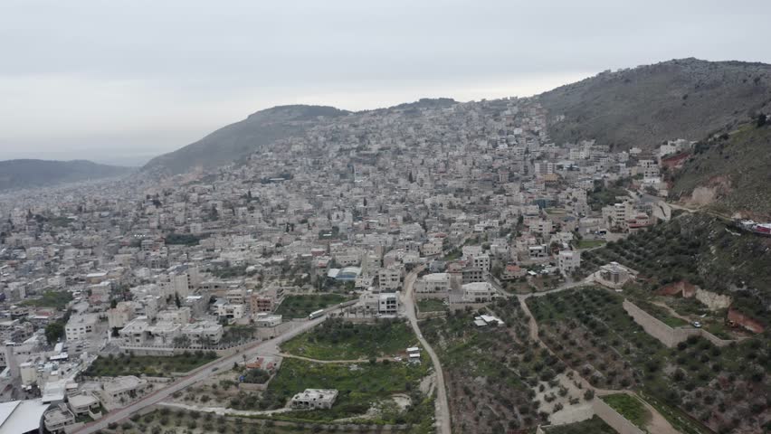 Aerial view over Arab village Deir al-Asad, 2023 Dir El Asad, Palestinian village, Cliff face and village, Upper Galilee, Israel