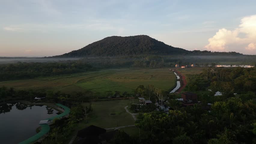 4K drone footage of Gunung Bintan towering over vast rice fields, illuminated by the soft morning sun