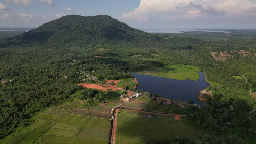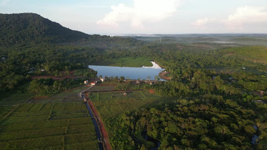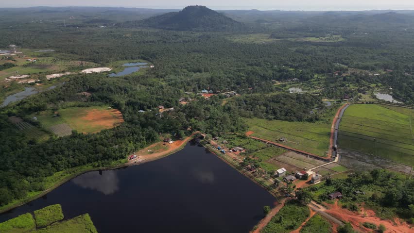 Aerial panoramic view of Gunung Bintan on Bintan Island, Indonesia, surrounded by lush tropical forests, vibrant rice fields, and a reflective water reservoir