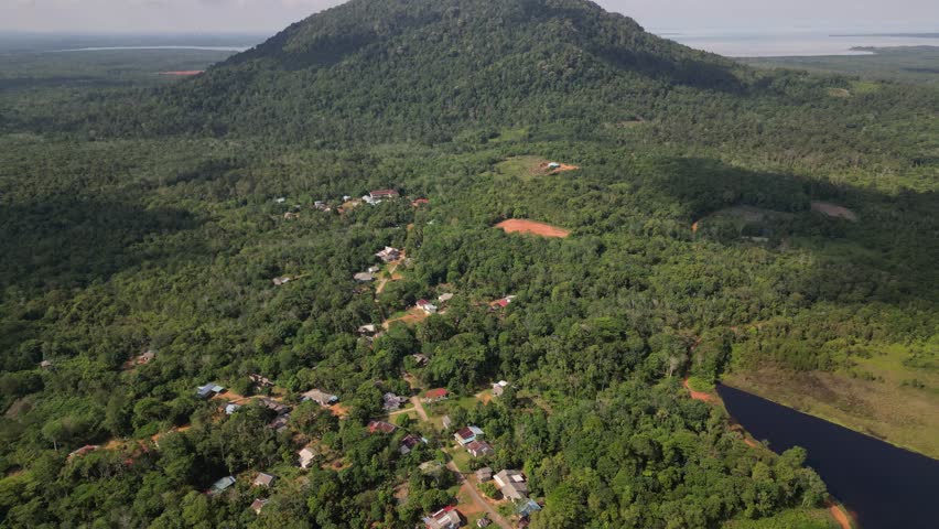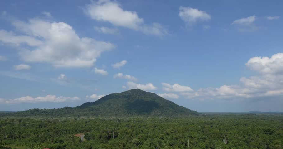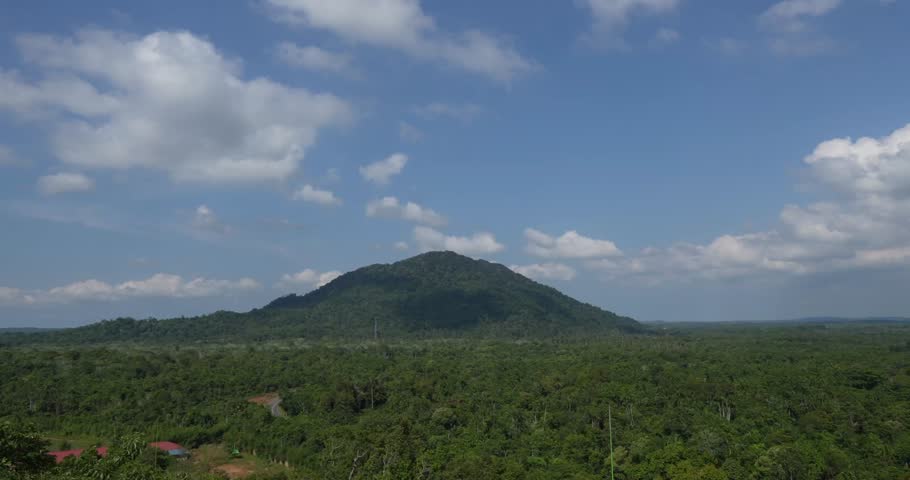 Beautiful panoramic drone shot in 4K showcasing Gunung Bintan, surrounding forests, lakes, and scattered villages
