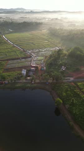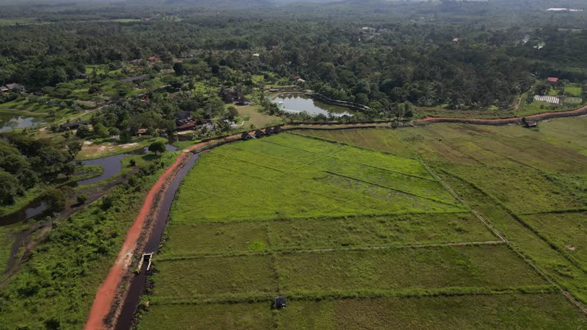 A cinematic aerial drone shot capturing the serene rural landscape of Bintan Island