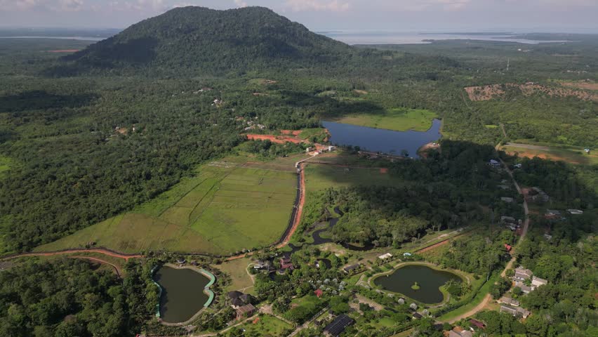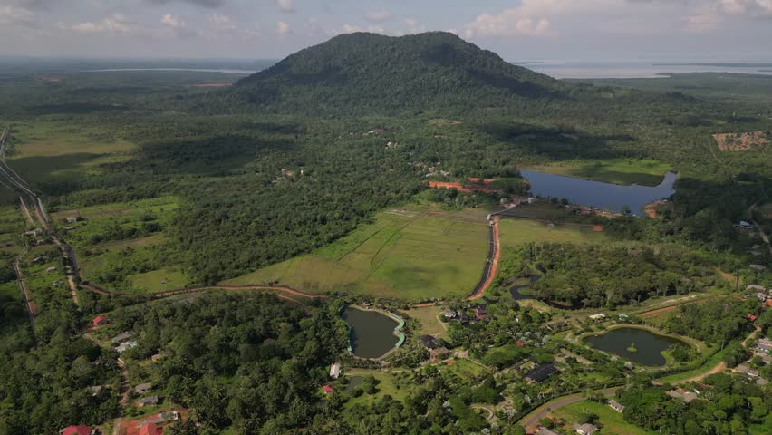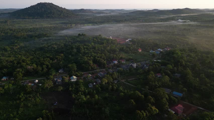 cinematic aerial drone shot capturing the serene rural landscape of Mountain Bintan