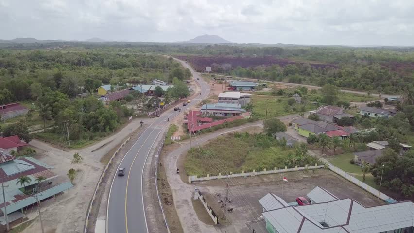 Drone aerial shot of a busy highway intersection surrounded by greenery and scattered housing in Bintan, Indonesia