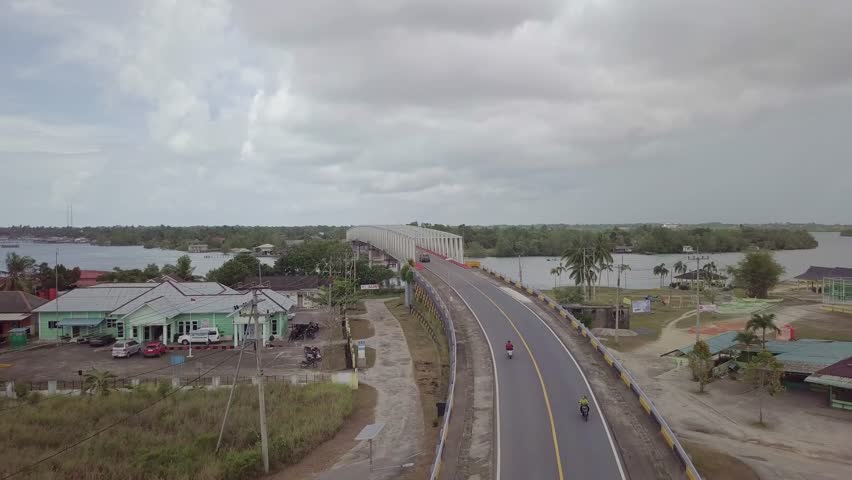 Aerial shot of a bridge connecting land across a coastal area with buildings and waterfront in Bintan, Indonesia