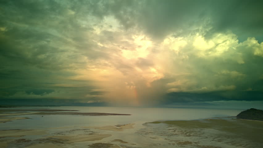 Dramatic aerial view of intense storm clouds and heavy rain over the tropical low tide flats of Bintan Island, Indonesia, with a bright rainbow breaking through the dark storm
