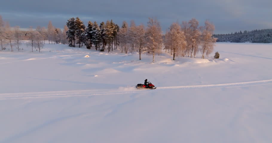 Aerial view following a snowmobile driving on snowy ice, sunset in the Nordics
