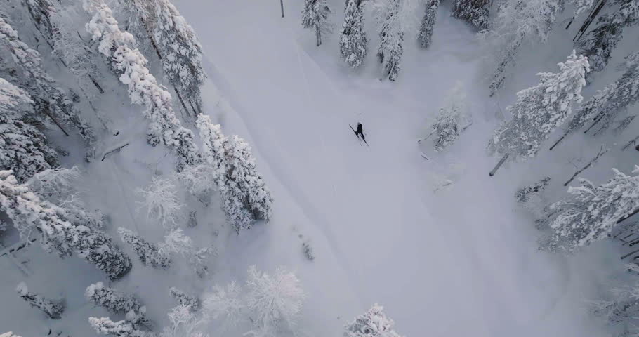 Aerial view tracking a person cross-country skiing in snowy forest of Lapland
