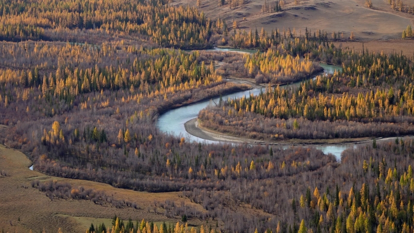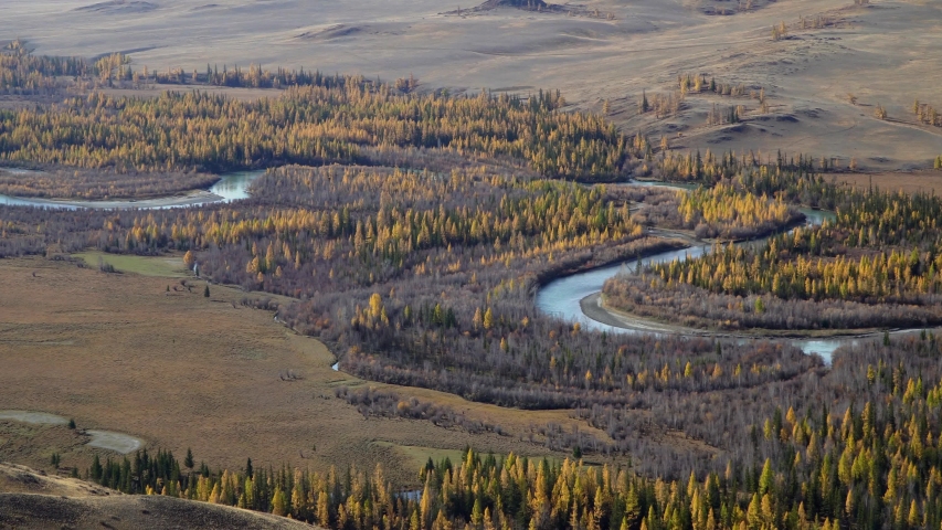 Panoramic shot of winding river in the Alyai mountans valley, Siberia