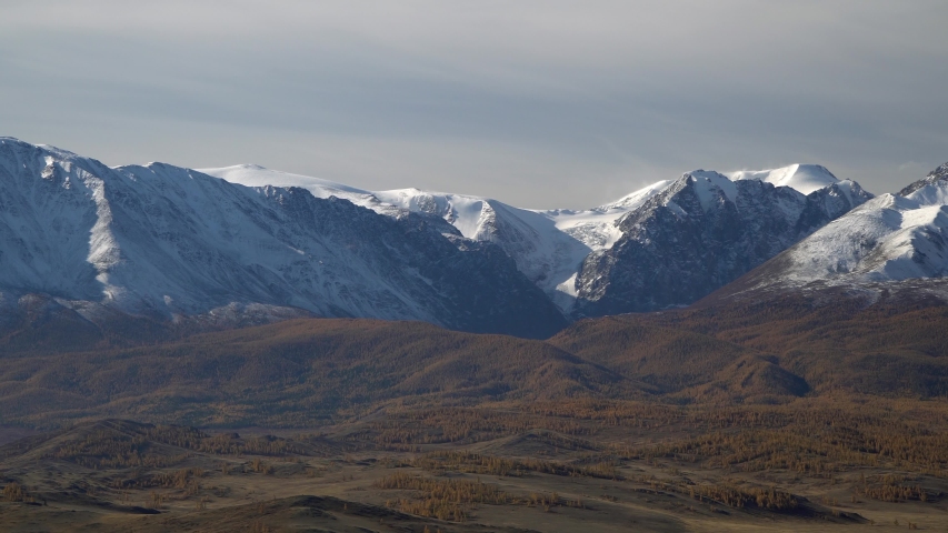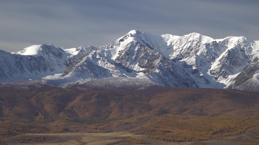 Beautiful zoomn-in shot of snowy Altai mountains on cloudy sky background
