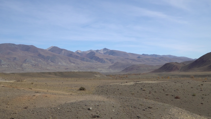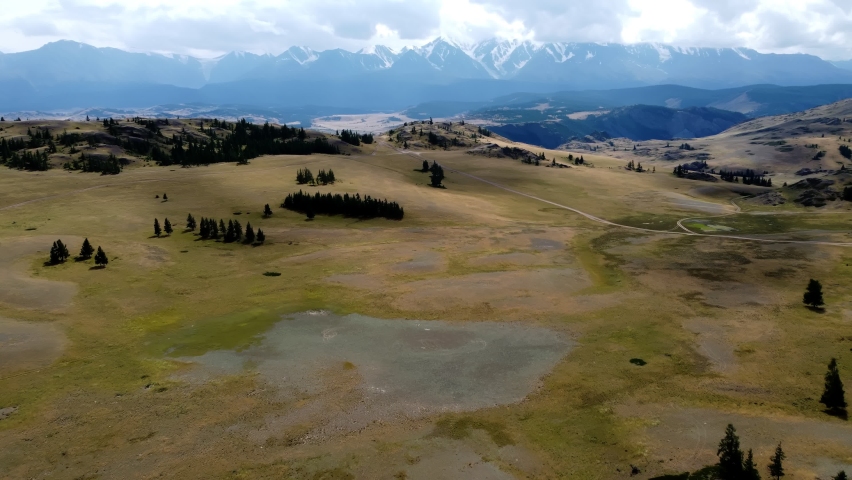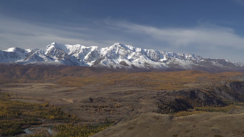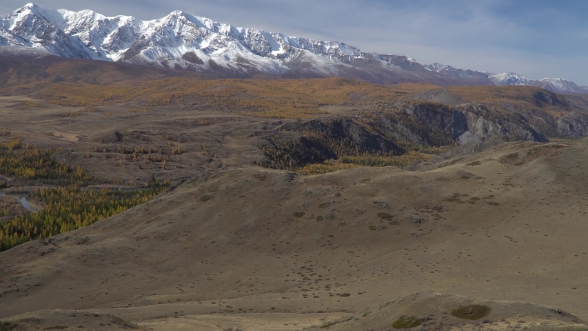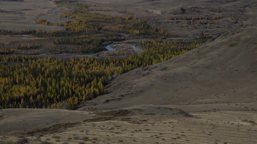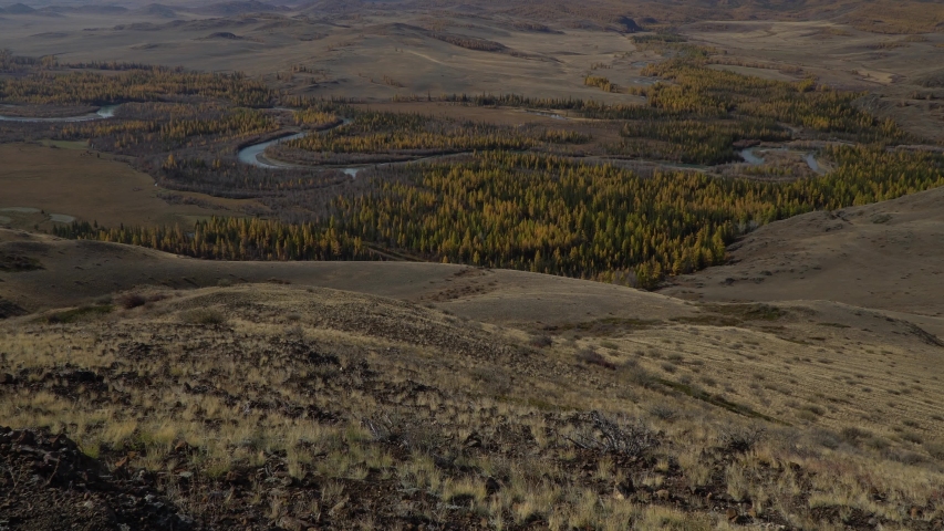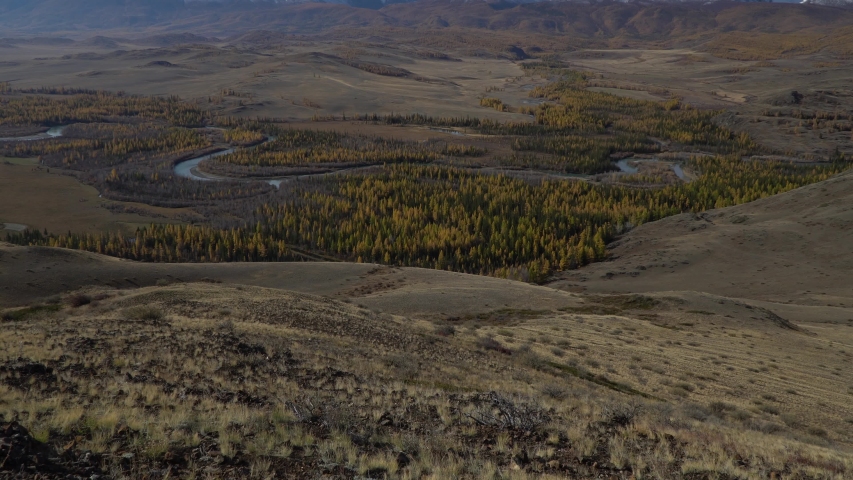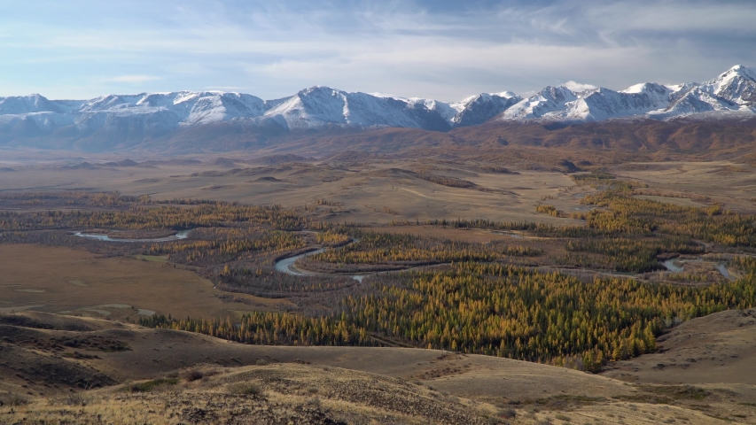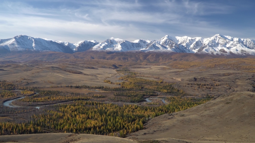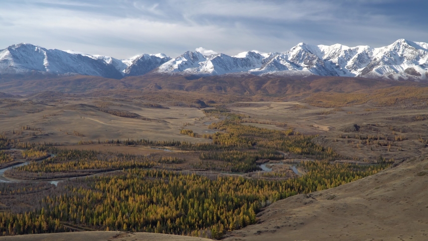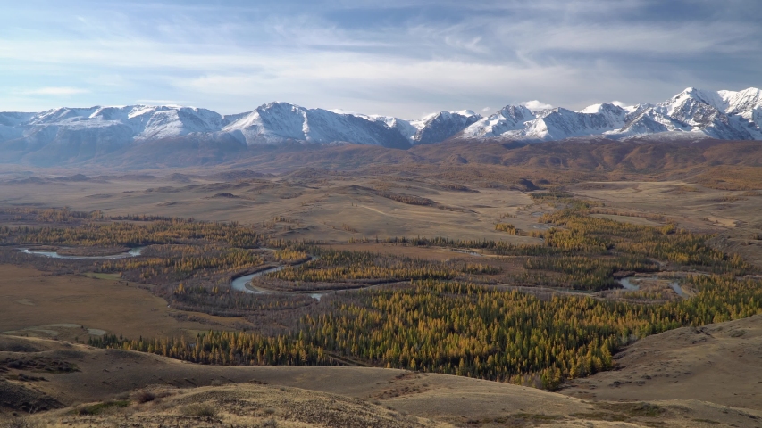 Beautiful slide shot of a valley with winding river and row of the Altai mountains on horizon in Siberia