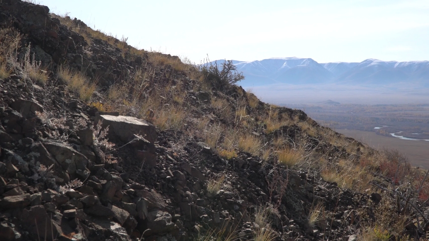 Beautiful panoramic shot of valley near the Altai mountains with a hill slope on foreground