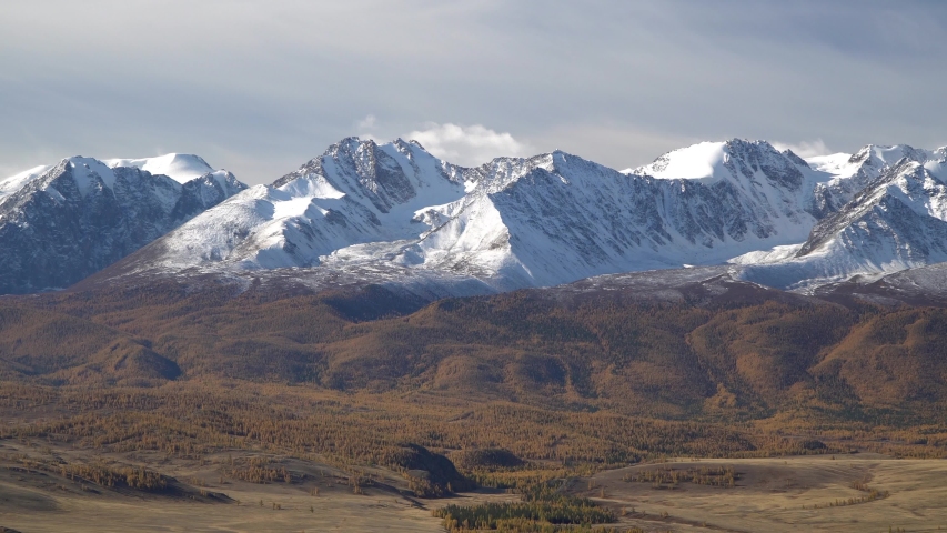 Beautiful panoramic shot of snowy Altai mountains peaks on cloudy sky background