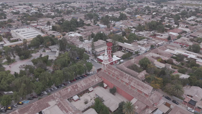 Wide drone shot around the town of Vicuña near Coquimbo in Chile South America with the main square and red tower Torre Bauer visible on a grey day LOG