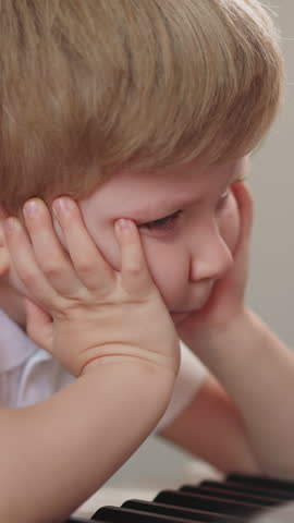 Little boy leans cheeks on hands and breathes out sadly at electric piano in class closeup