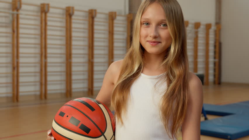 Caucasian schoolgirl child throwing ball young kid daughter pupil play sport physical education sportswoman girl happy enjoy basketball game student smiling playing college school class teenager gym