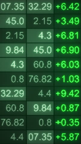 Looping 3D render of financial ticker matrix with numeric rows and gains color coded in green on digital display for business, investment, and fintech content