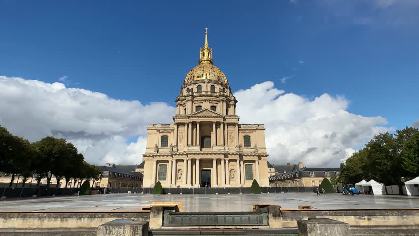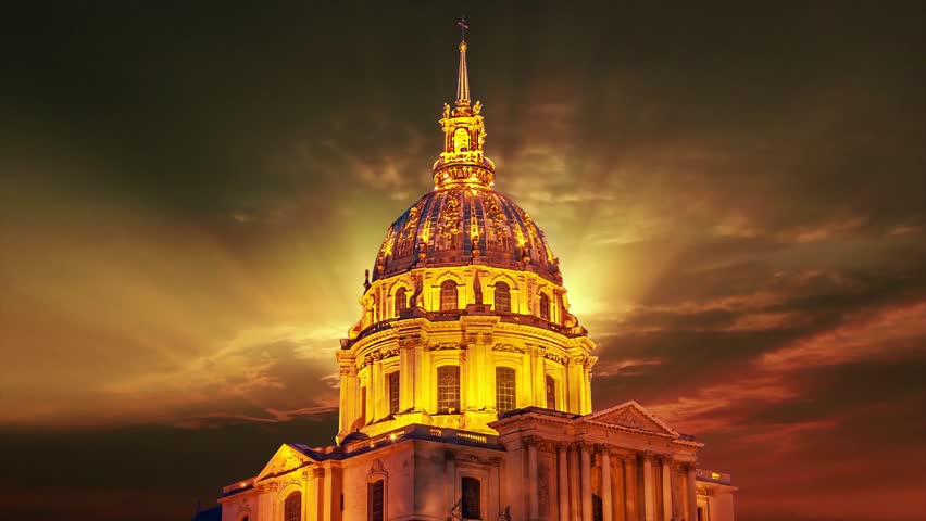 Les Invalides (The National Residence of the Invalids) against the background of the sunset (4K, time lapse)