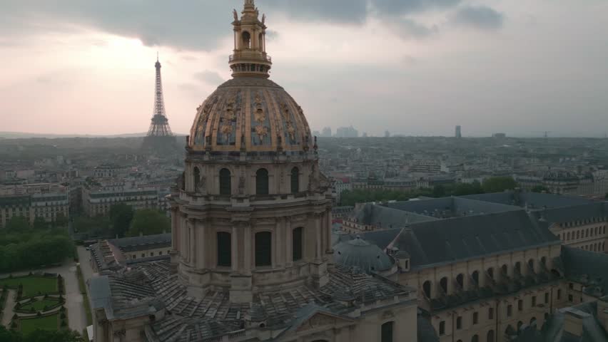 Tight circling shot of the Eiffel tower and Hôtel des Invalides at sunrise