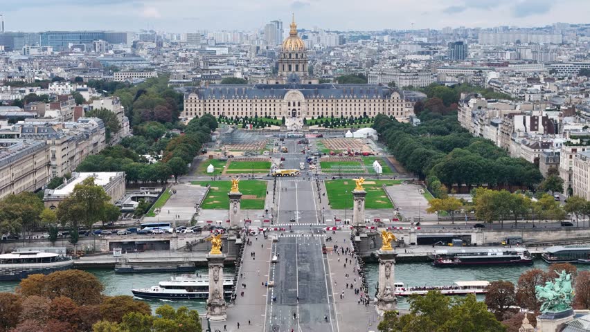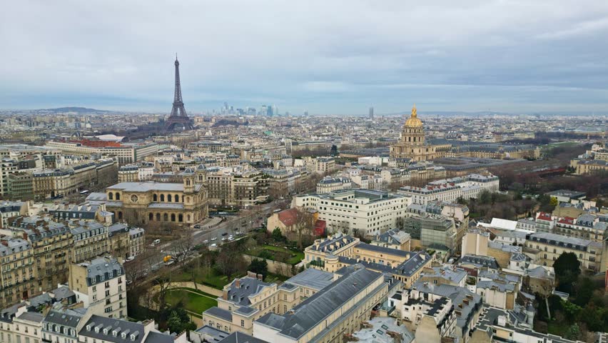 Aerial wide-angle view of Les Invalides and its iconic golden dome, surrounded by the dense urban landscape of Paris, France