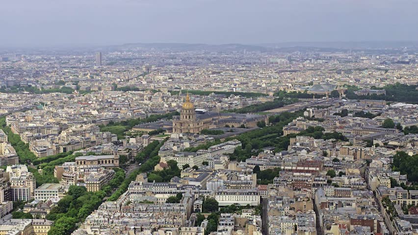 The famous Eiffel Tower and the Invalides seen from aerial view, Paris, France