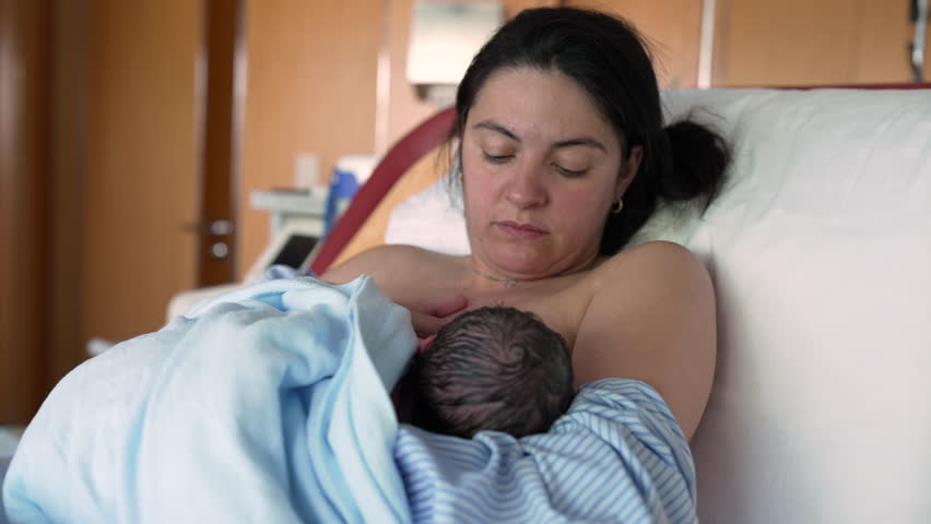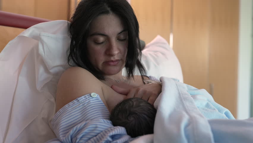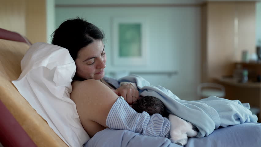 New mother bonding moment with her newborn baby at hospital after giving birth, breastfeeding infant child in post-birth at clinic