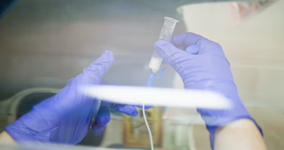 Newborn baby in hospital incubator receiving medical care