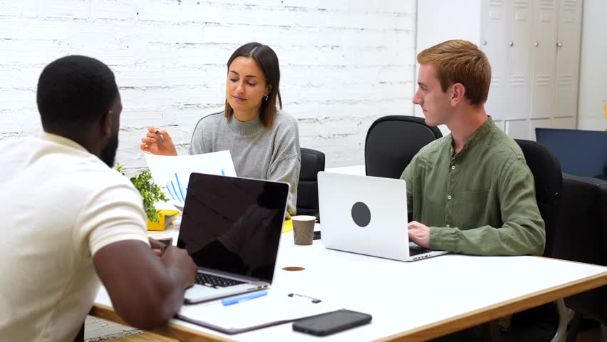 Multiracial people working using laptop in a modern coworking space with shared tables
