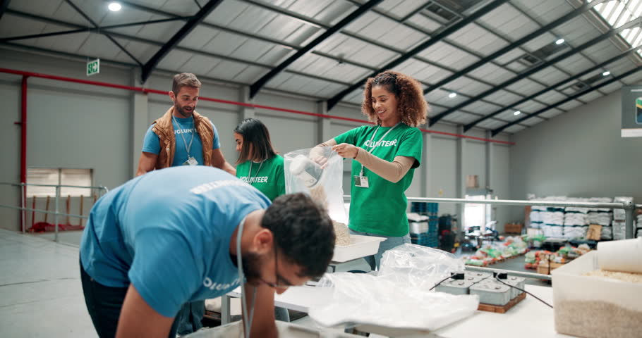 Charity, food drive and teamwork with volunteer group packing donations for community outreach
