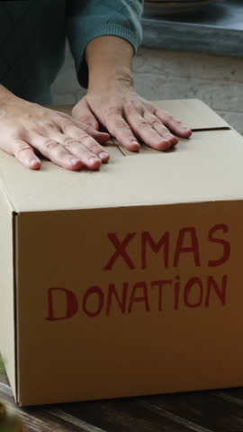 Group of volunteers preparing free food donations of foodstuffs in cardboard boxes for poor people