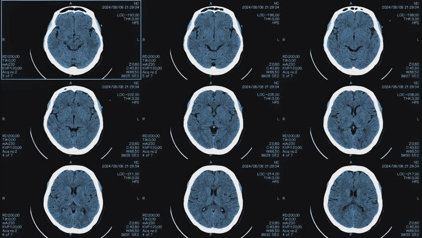 Magnetic resonance images of the head, MRI of the brain,top viev of a patient with multiple vascular infarctions, 3x3 image grid, color animation Seamless Loop