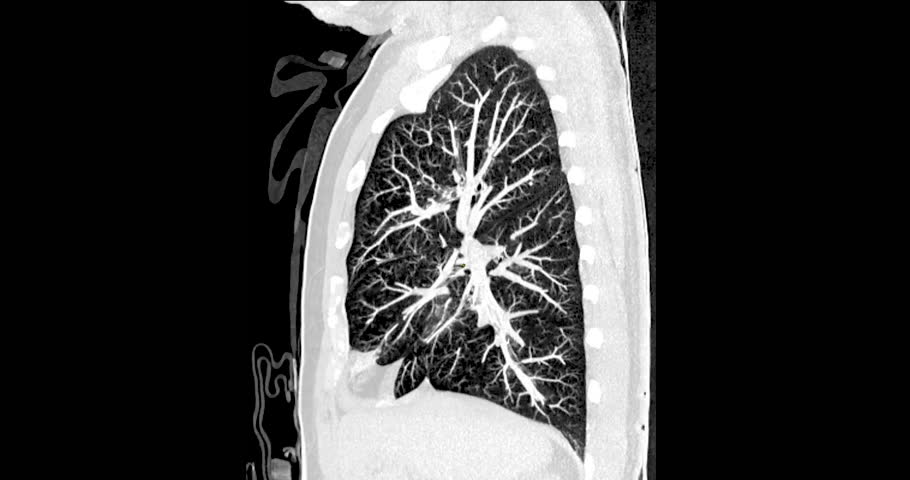 CT Chest sagittal view Normal Study: CT chest footage reveals normal lung, heart, and mediastinal structures, showing no signs of abnormalities, ensuring a healthy thoracic region