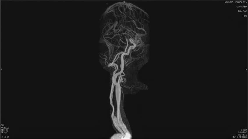 Magnetic resonance images of the brain, MRI of the brain, of a patient with multiple vascular infarctions, Contrast study of cerebral vessels, animation Seamless Loop