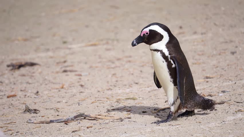 A lone penguin stands on a sandy beach, its black and white feathers contrasting against the golden shoreline